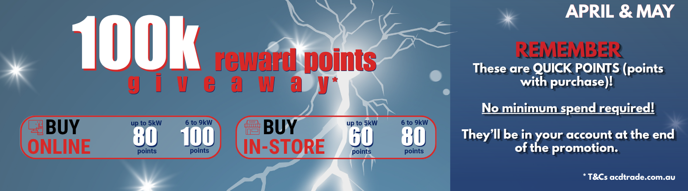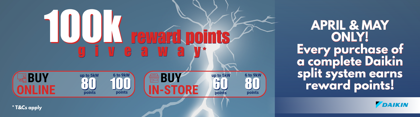 Daikin 100k Rewards Points GiveawayEvery purchase of a complete Daikin split system, during April and May, earns you up to 100 Reward Points.Read more